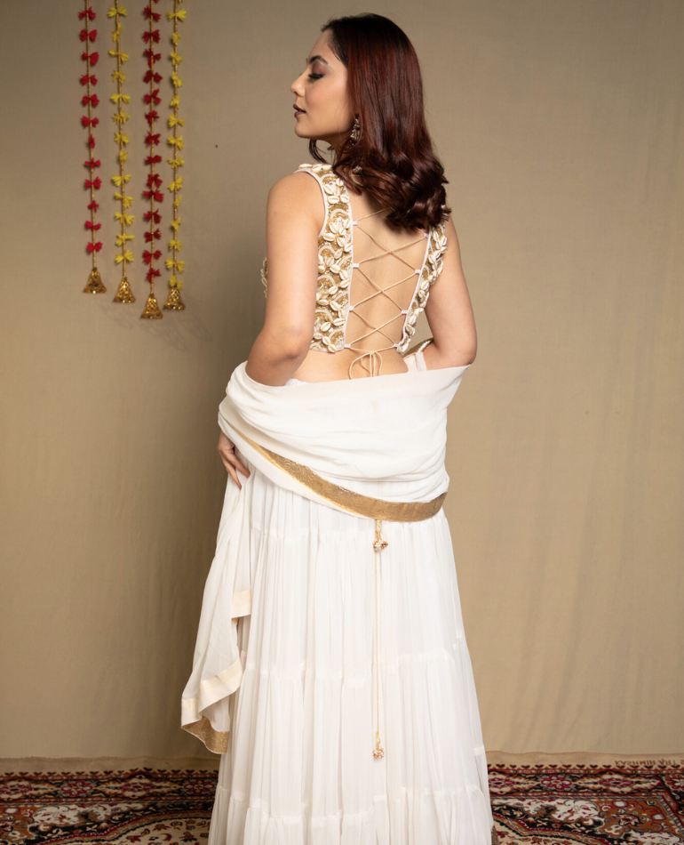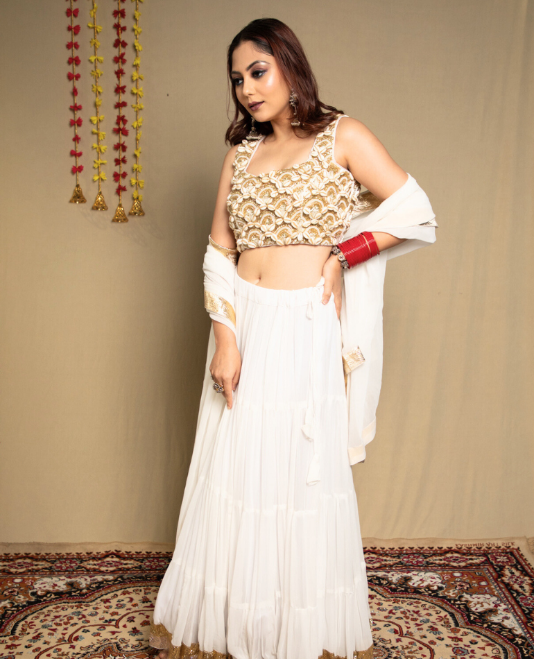 Radiate purity, elegance, and celebration with the Mira chaniya choli — a celestial white and gold ensemble. Designed for divine movement and luminous energy, this handcrafted look is a blend of graceful heritage and contemporary finesse, perfect for Garba nights, dandiya raas, or festive rituals.