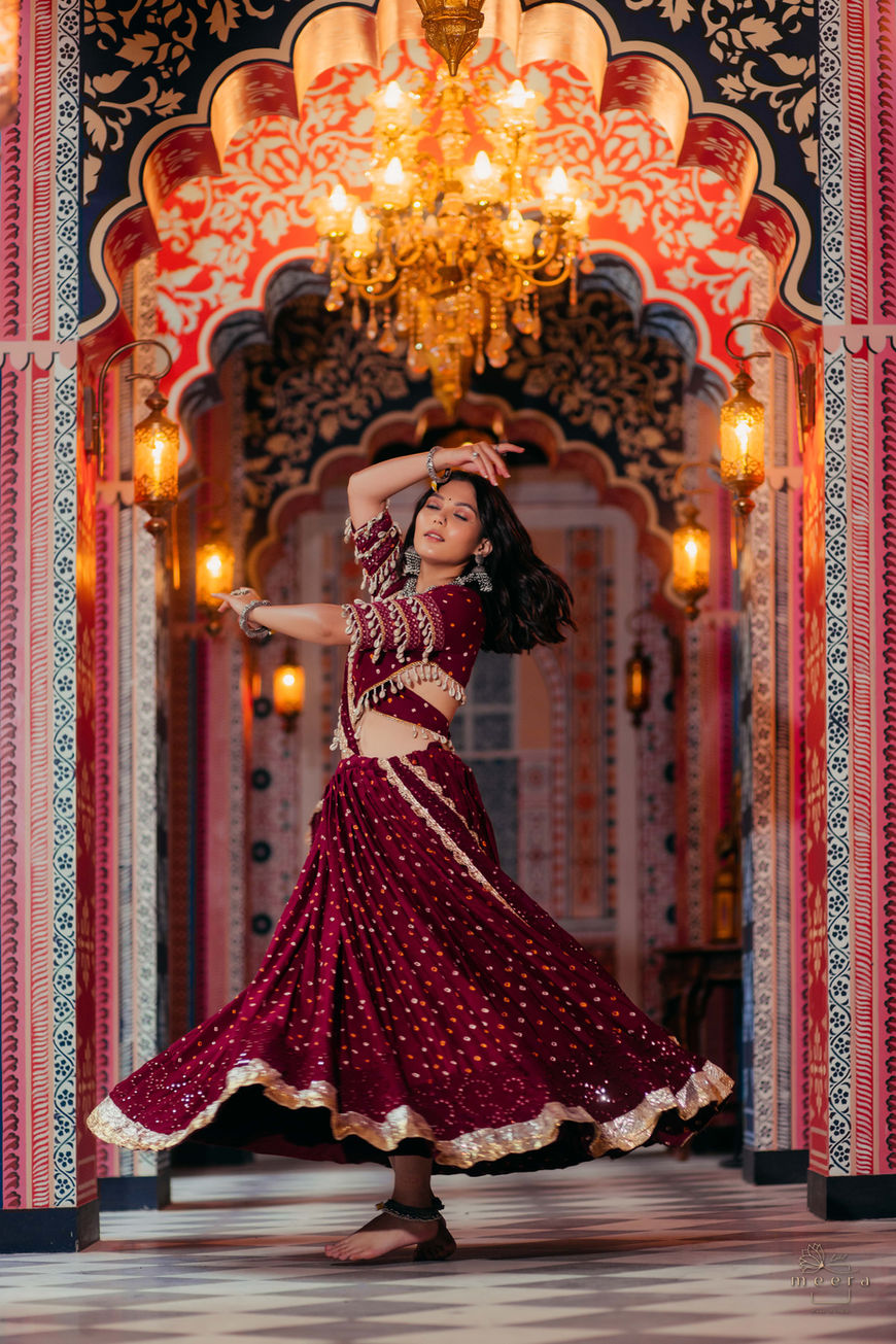 This stunning maroon bandhani lehenga set is sure to make a statement. Crafted from pure cotton, the set features an intricately detailed bandhani print and intricate hand embroidery. The set includes a lehenga, choli and dupatta. The dupatta is adorned with a thick gold border for a luxe look. Perfect for special occasions, this lehenga set is sure to make you look beautiful.