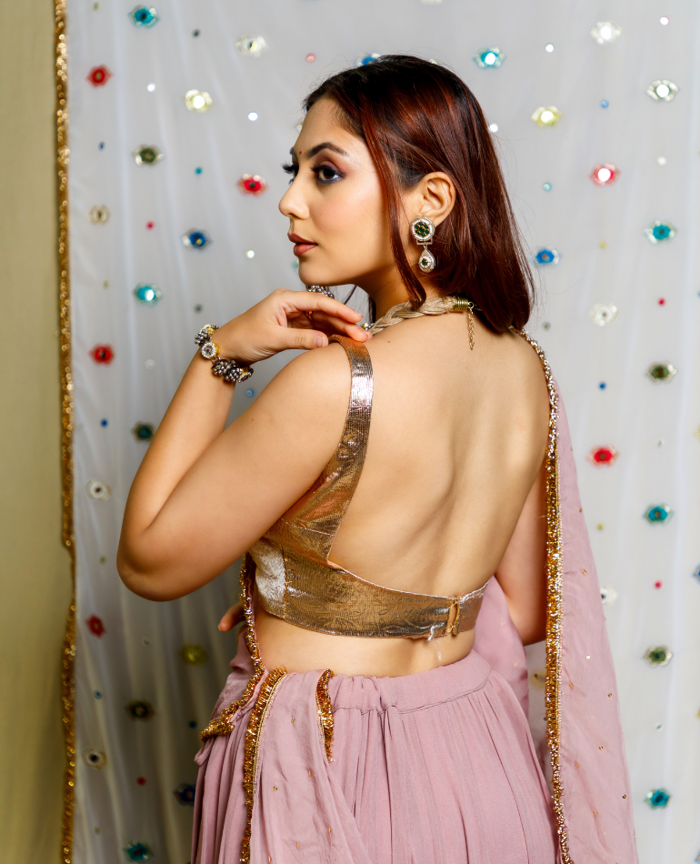 Crafted in soft georgette, this dusty rose lehenga features multiple layers of delicate gathered panels, flowing beautifully with every twirl. The hemline is finished with a stunning wide zari border in antique gold, adding a rich contrast to its pastel palette.