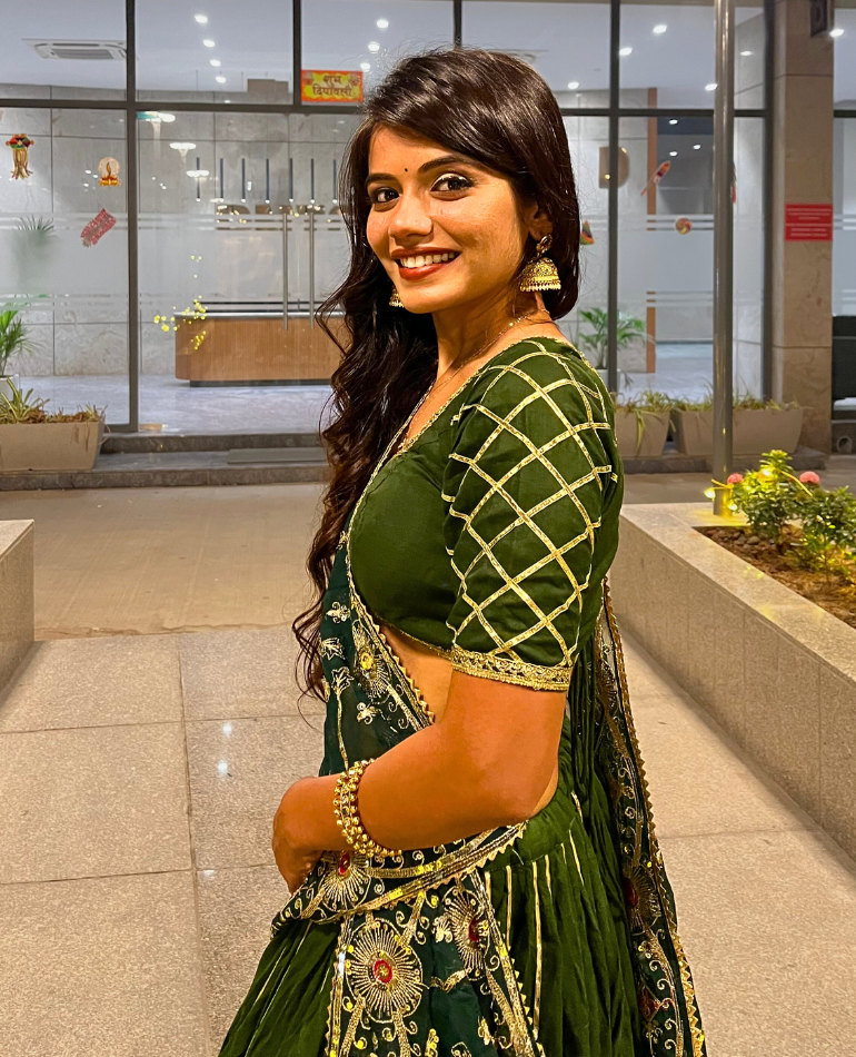 A regal celebration of green, gold, and grace – this chaniya choli set brings a royal Gujarati charm to your Navratri twirls.